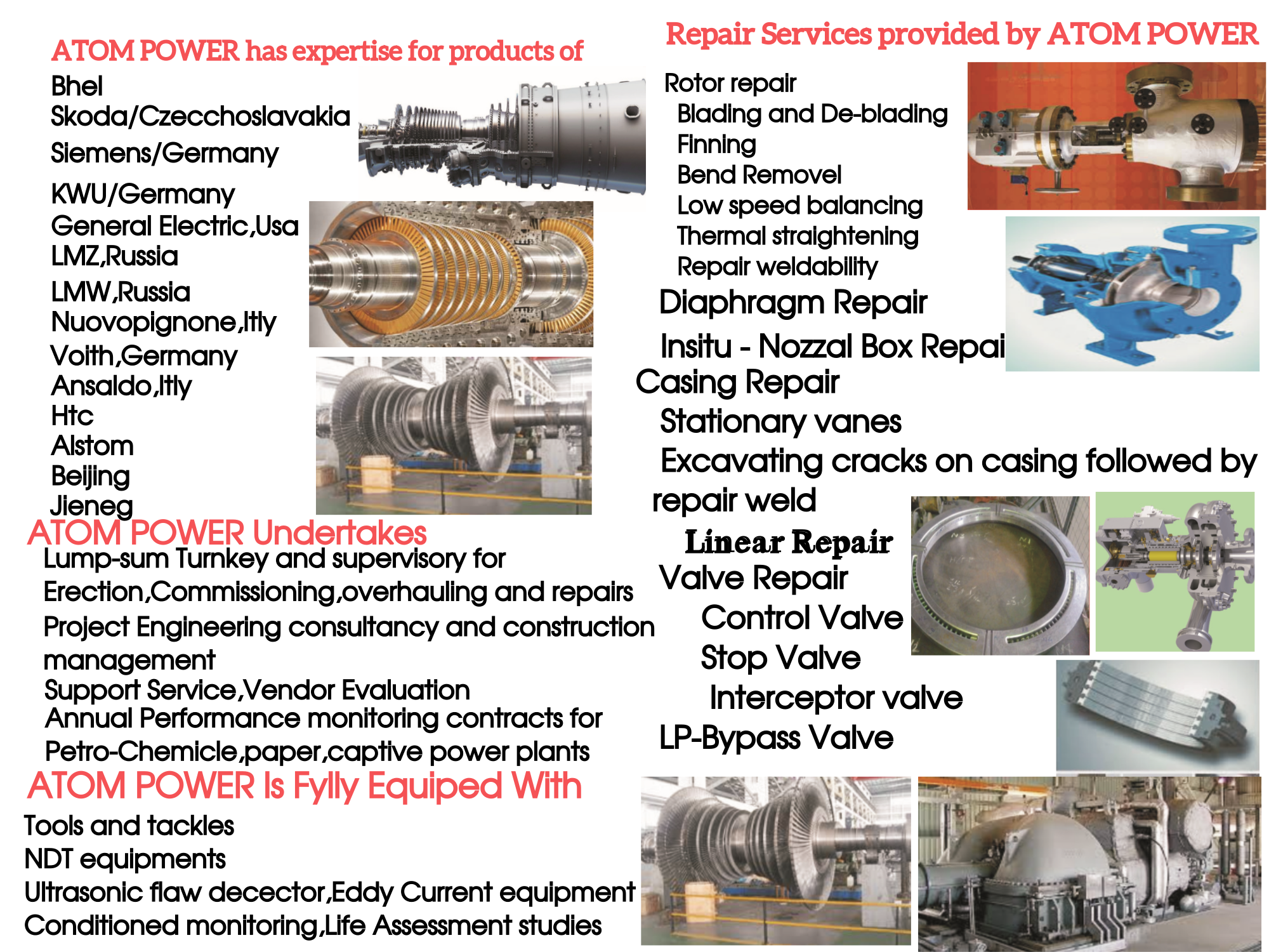 At ATOM POWER ,Single largest pool with highly experienced BHEL,NTPC,L&T,GE,Siemens and power utilities like MAHAGENCO Engineers having collective experience of over 500 man-years in Energy sector Highly experienced team on all make and type of TG Sets Quality of work maintained to OEM standards at considerable low cost. A very reliable service organization with prompt response. Reverse Engineering of high cost components with strong ability to blend technologies. Professionally managed Company blending best practices of organizations like BHEL, GE.